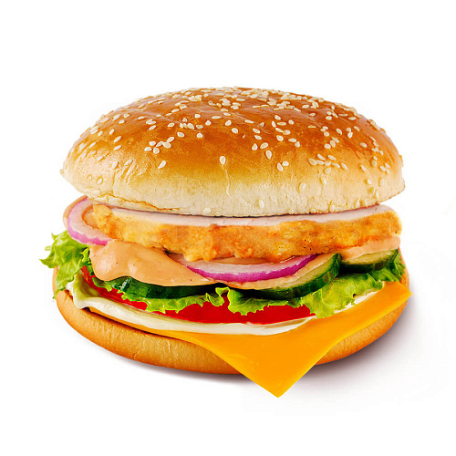 Большая булочка с кунжутомфиле куриное фрипомидорогурецсалатлуксыр Хохландсоус