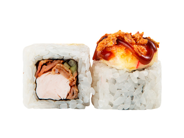 Риснорикурица копченаябекон криспиогурец лук фри,соус сырный крабсоус унагинабор для роллов