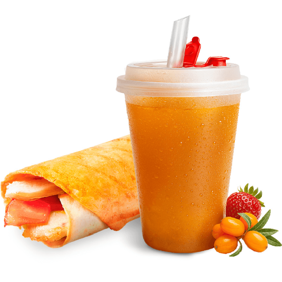 Пунш клубнично-облепиховый Облепиха Клубничный сироп Лимон Вода Чикен Крут Лепешка пшеничная Филе куриное фри Помидор Масло чесночное Продукт Моцарелла Соус